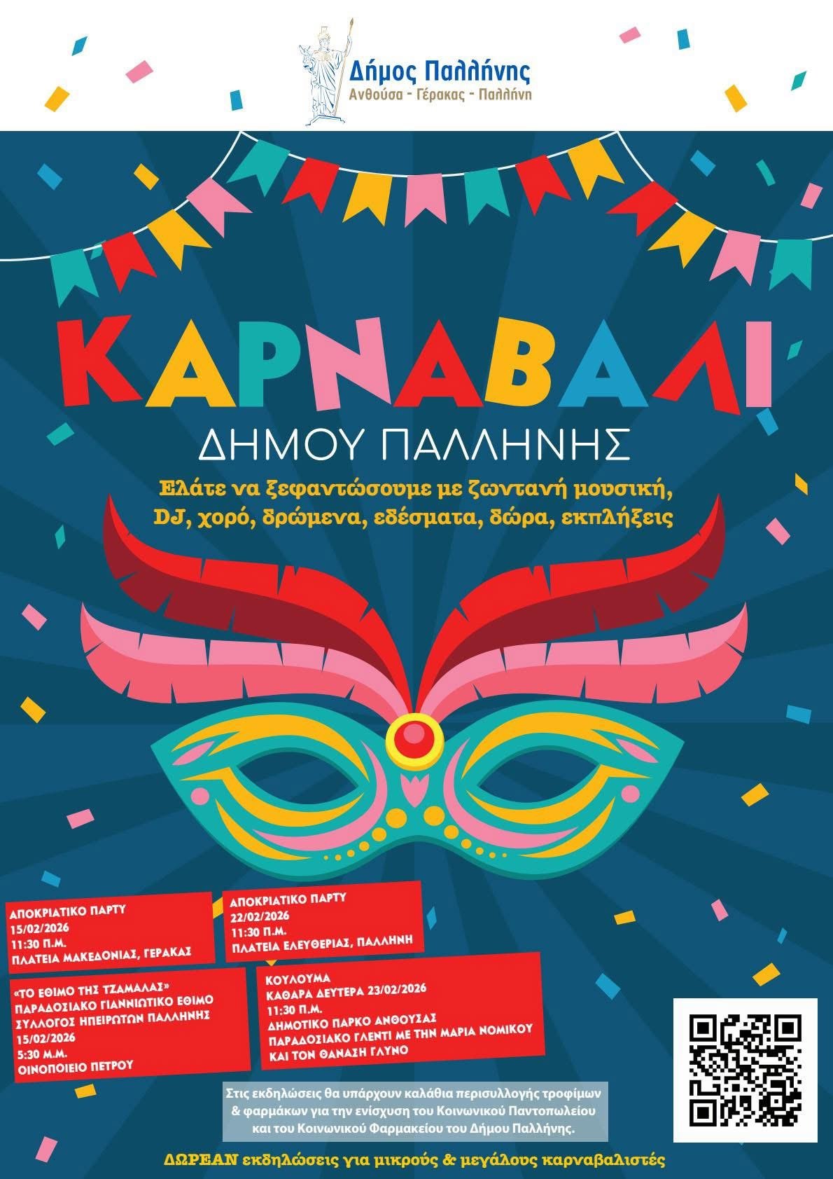 🎉 Με κέφι, ρυθμό και ξεχωριστές δωρεάν εκδηλώσεις για μικρούς και μεγάλους, ο Δήμος Παλλήνης γιορτάζει τις Απόκριες 2026 και την Καθαρά Δευτέρα, προσκαλώντας όλους τους δημότες να φορέσουν τις αποκριάτικες στολές τους και να συμμετάσχουν σε ένα πλούσιο εορταστικό πρόγραμμα γεμάτο μουσική, χορό, παράδοση και διασκέδαση.