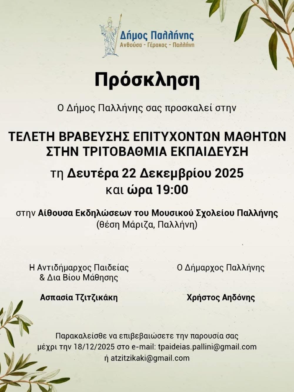 Ο Δήμος Παλλήνης βραβεύει τους επιτυχόντες μαθητές του στην Τριτοβάθμια Εκπαίδευση στο Μουσικό Σχολείο Παλλήνης