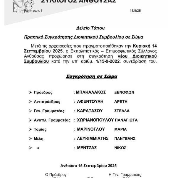 8 Ιουλίου, 2025Πρόγραμμα εκδηλώσεων «Ανθουσιώτικα 2025» – Γιορτάζουμε όλοι μαζί στην Ανθούσα! Ο Δήμος Παλλήνης σας προσκαλεί στα...