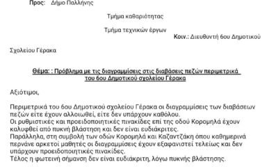 Αίτημα για διαγραμμίσεις δρόμων για την ασφάλεια των μαθητών της Μπαλάνας Γέρακα