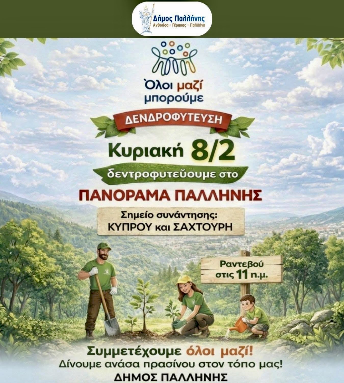 Ο Δήμος Παλλήνης προσκαλεί τους πολίτες όλων των ηλικιών σε μία γιορτή για το περιβάλλον! Την Κυριακή 8 Φεβρουαρίου 2026 και ώρα 11:00, θα πραγματοποιηθεί δράση δεντροφύτευσης στο Πανόραμα Παλλήνης, με στόχο την ενίσχυση του αστικού πρασίνου και την προστασία του φυσικού περιβάλλοντος.
